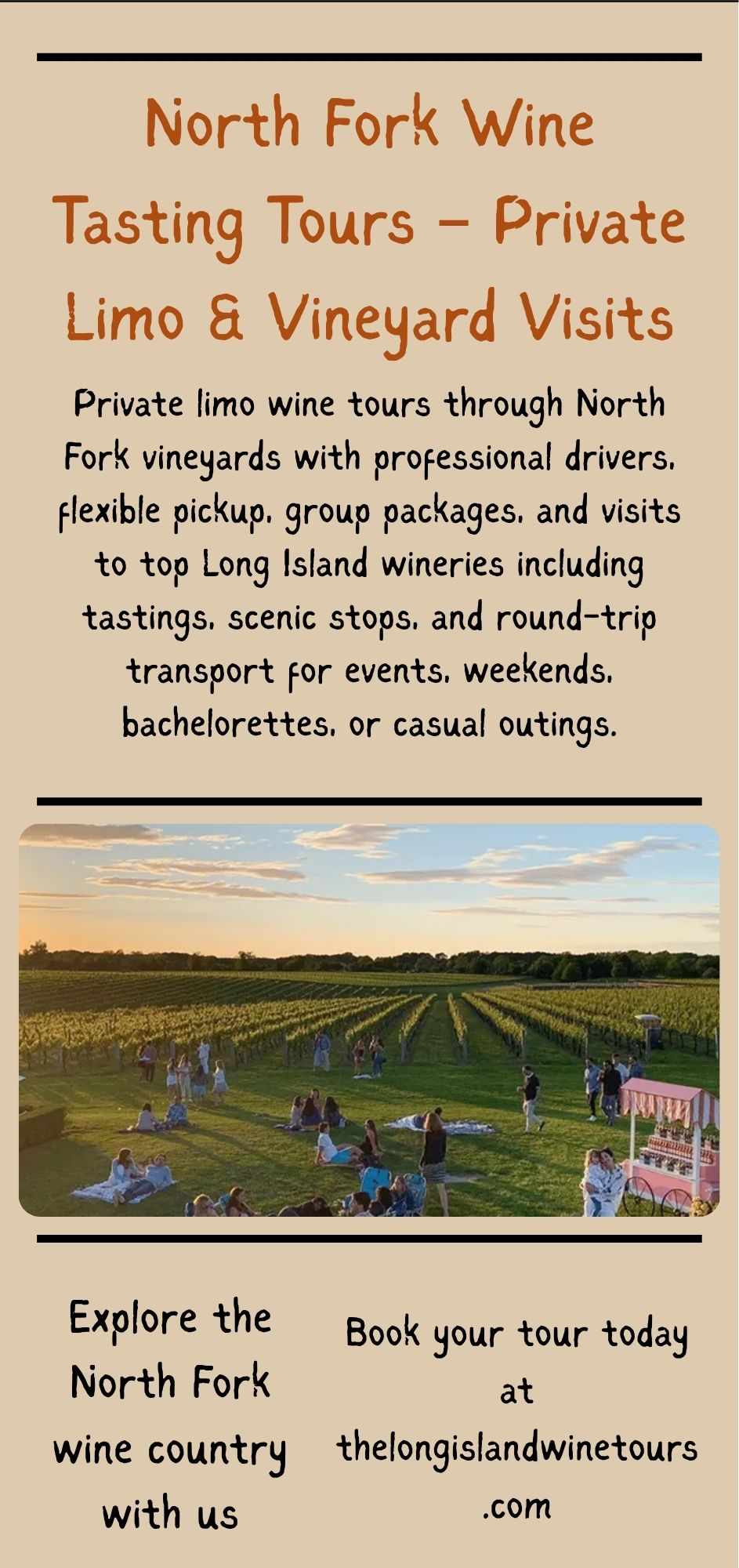Private limo wine tours in North Fork with professional drivers, flexible pickup, and group packages. Visit top Long Island wineries for tastings, vineyard views, and scenic stops. Ideal for weekends, events, or bachelorette parties with round-trip transport included. Book your wine country tour today at Long Island Wine Tours.